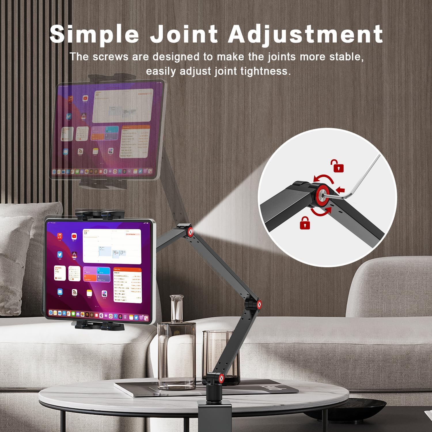 Anti-scratch clamping base: The iPad stand table comes with an adjustable clamping foot that can be opened up to 5.8 cm, making it compatible with most desks on the market and provides maximum stability. The iPad Desk Clamp Stand is equipped with non-slip rubber pads to protect your furniture from scratches, so you can securely attach it to your desk, bed, table, bedside table, kitchen counter, bookcase, etc.
