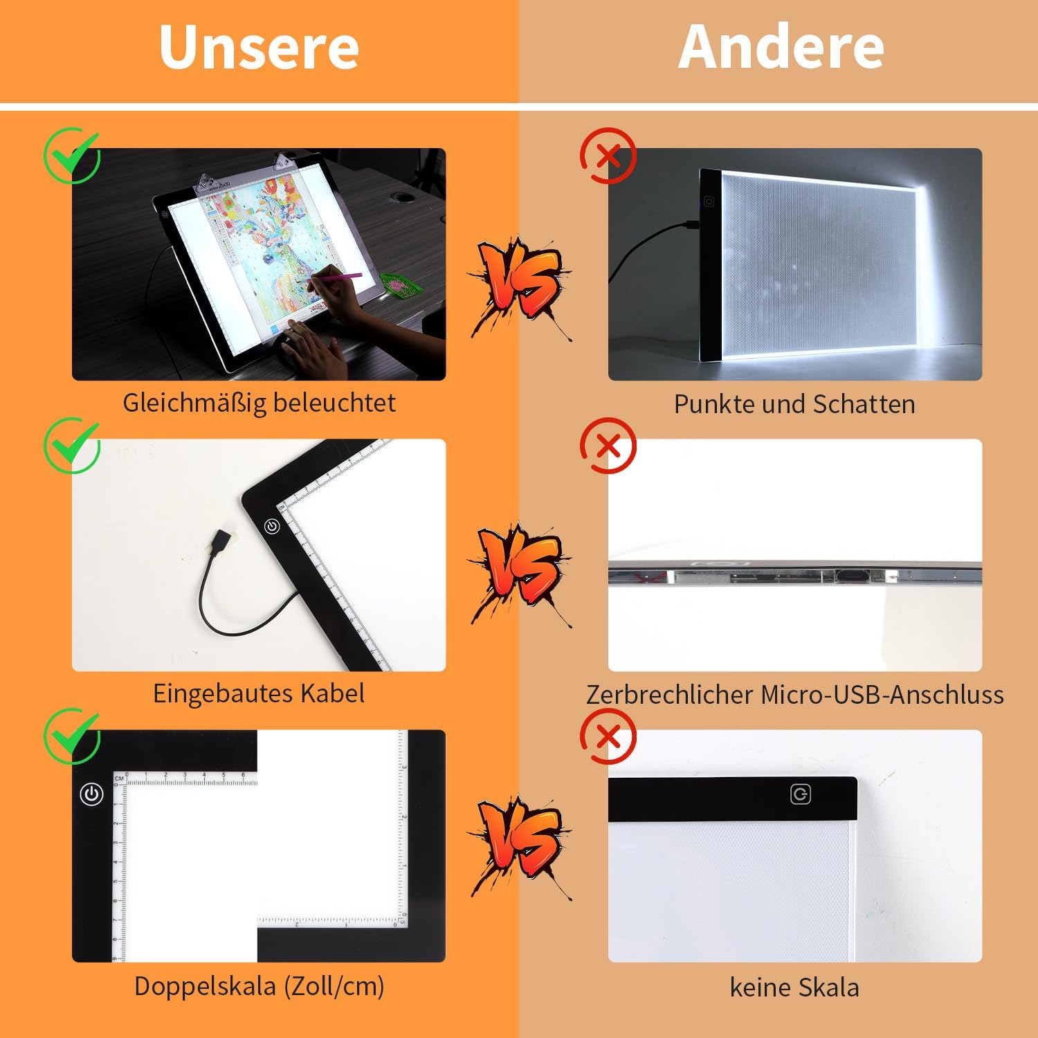 Paket enthalten Size of the lichtpaneels: 421 mm x 320 mm, working area: 371 mm x 269 mm. You can easily put it in your backpack, very portable. The LED light box kit includes: 1 x A3 light pad, 1 x multi-function stand, 1 x 1.8m type-c cable, 4 x clips.