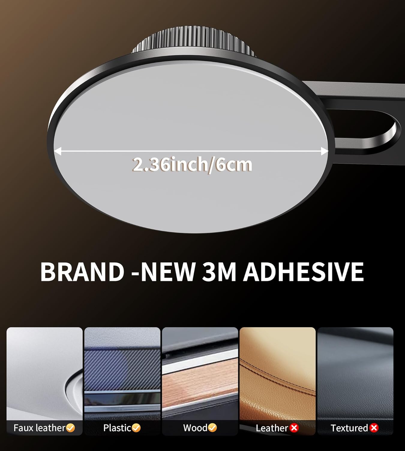 【2 sets of 3M adhesives】This is for i-phone car phone holder sticker diameter 3M VHB is 6cm/2.36 inches, which makes bonding more stable. It is less likely to damage the interior compared to these traditional suction competing products. It also comes with a backup adhesive to replace if you want to tear off the original 3M adhesive.