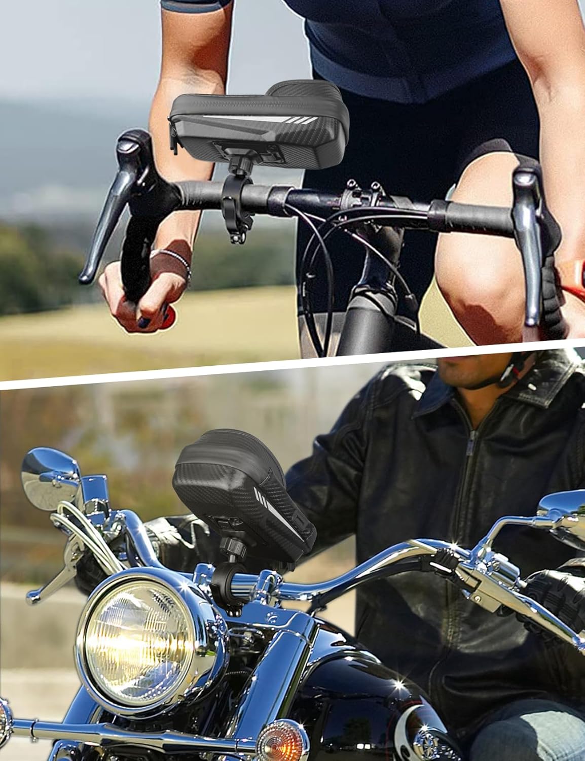 Bag with rain cover: With hard EVA materials and a waterproof double zipper, the bike phone holder withstands light rain. A waterproof rain cover is provided to further protect the bike bag in heavy rain. This waterproof bike phone holder protects your items from rain, snow, mud and dust. However, it cannot be immersed in water or rain for a long time.