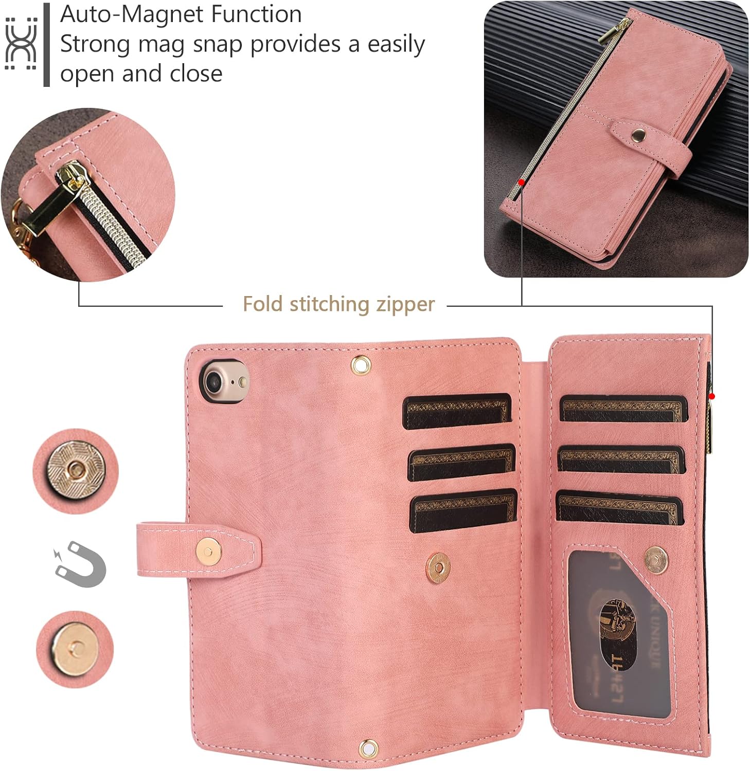 Card slots: This UEEBAI case includes 9 card slots and 2 pockets for banknotes. One of the bill straps is designed with a zipper so you can better keep your ID/credit card/money Built-in magnetic clasp keeps your phone/cards/cash securely