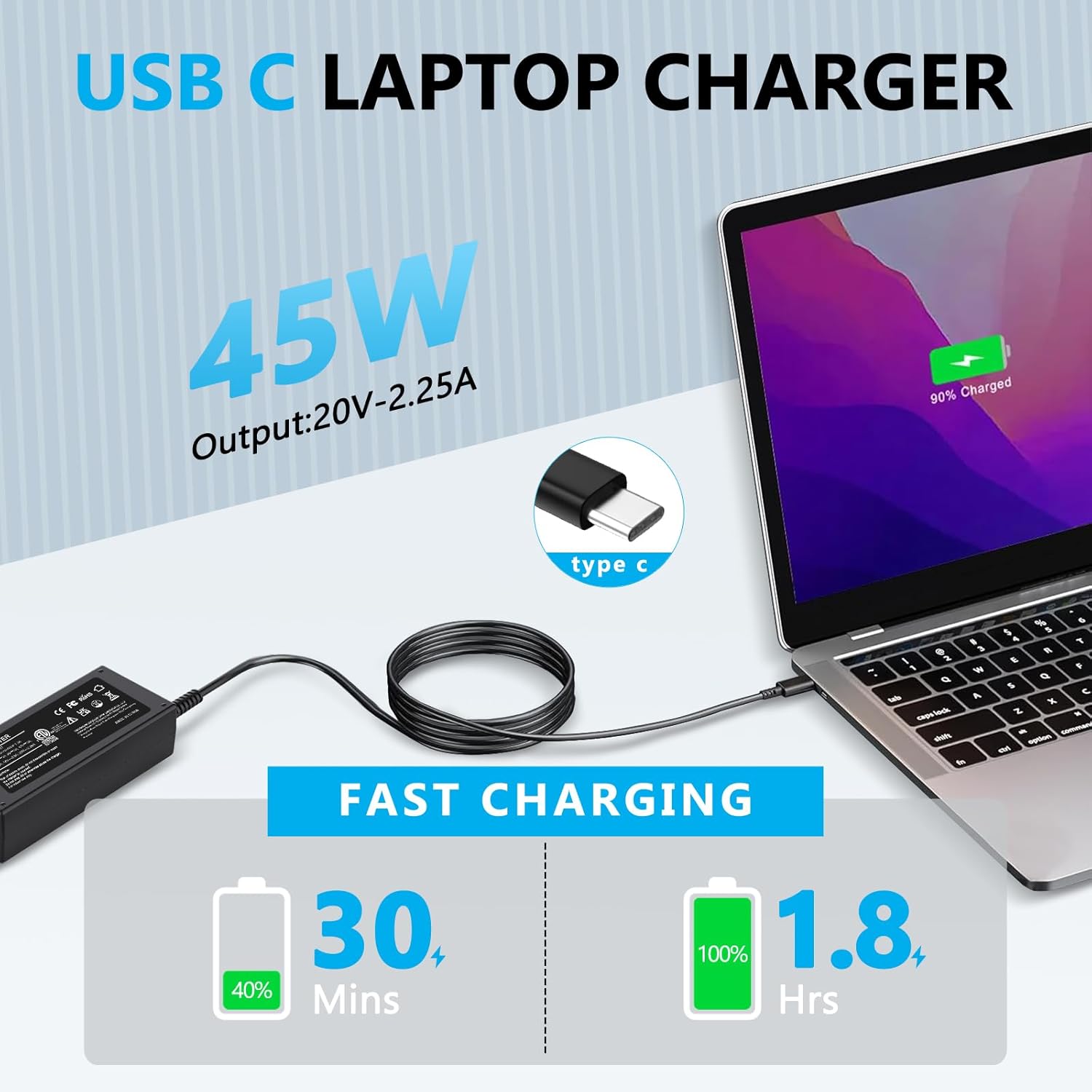 Après l’achat : Chaque chargeur est testé avant d’être expédié, vous recevrez un adaptateur AC 45W neuf et un long cordon d’alimentation USB C. Si pour une raison quelconque vous n’êtes pas 100% satisfait de notre chargeur adaptateur 45W, veuillez nous contacter, nous vous répondrons dans les 24 heures.