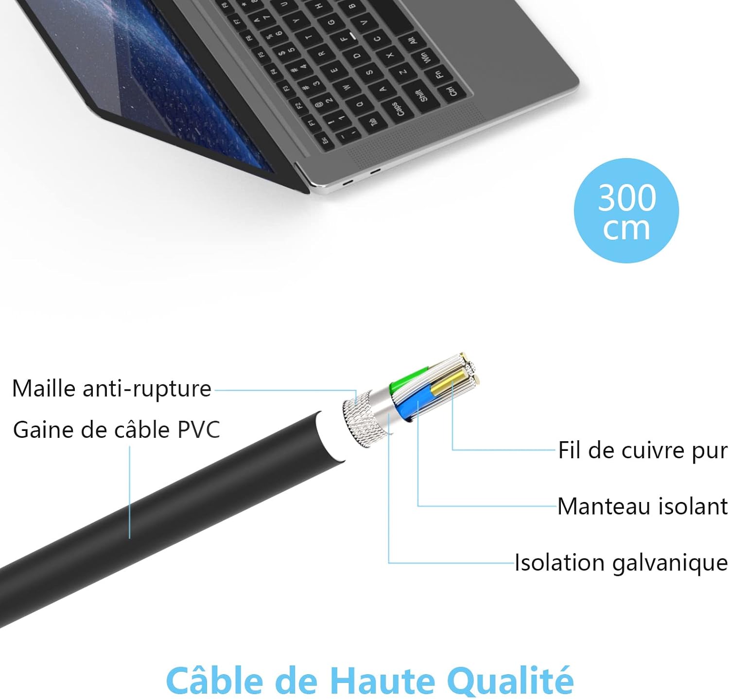 Le fil de haute qualité est composé d’un noyau en cuivre étamé, d’un fil de terre, d’une feuille d’aluminium et d’une gaine en PVC, qui transmet l’électricité avec économie d’énergie, améliore considérablement la durabilité et la durée de vie du fil et rend votre ordinateur portable plus stable lors de la charge.