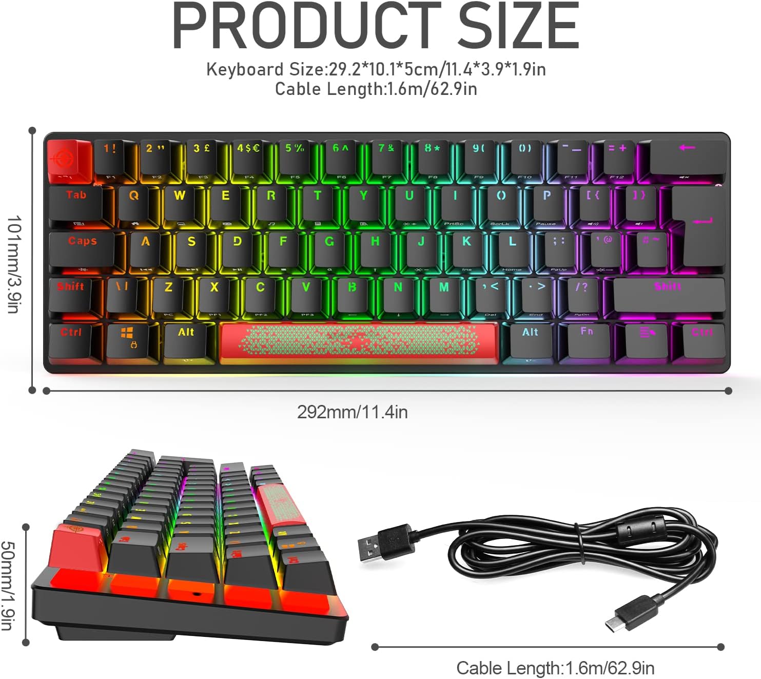 Design minimaliste à 60 % : ce clavier de jeu mécanique adopte une disposition compacte à 62 touches et un clavier lumineux avec un symbole vif, intégrant beauté et praticité, équipé d’un long câble USB de type C (environ 1,6 m), peut être facilement branché et joué, taille mini, léger, économise de l’espace, maximum pour utiliser votre espace de bureau supplémentaire, facile à transporter ou à utiliser quand et où vous êtes, parfait pour la maison, le travail ou en déplacement.