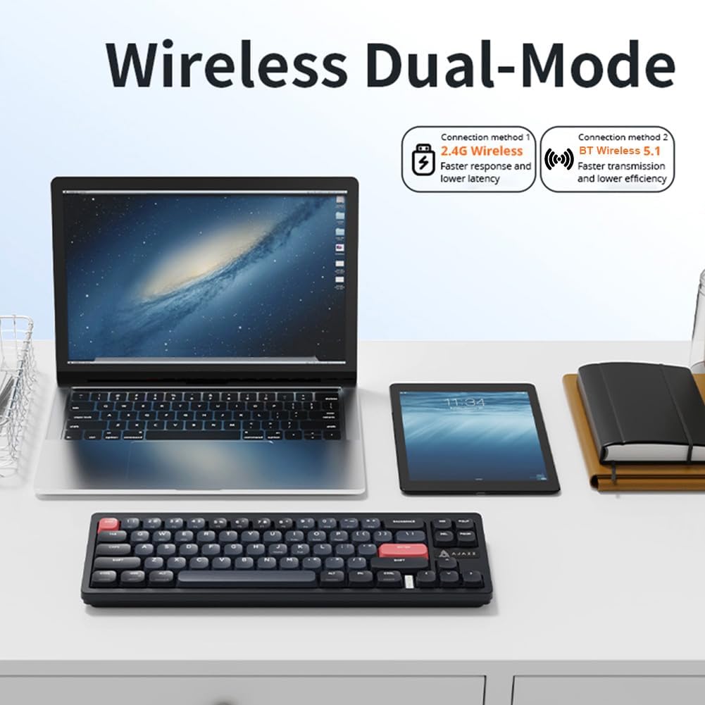 Double mode sans fil pour plus de liberté : ce clavier de jeu est compatible avec les ordinateurs de bureau, les ordinateurs portables, les tablettes, les smartphones et autres appareils, permettant une connectivité et une polyvalence transparentes.
