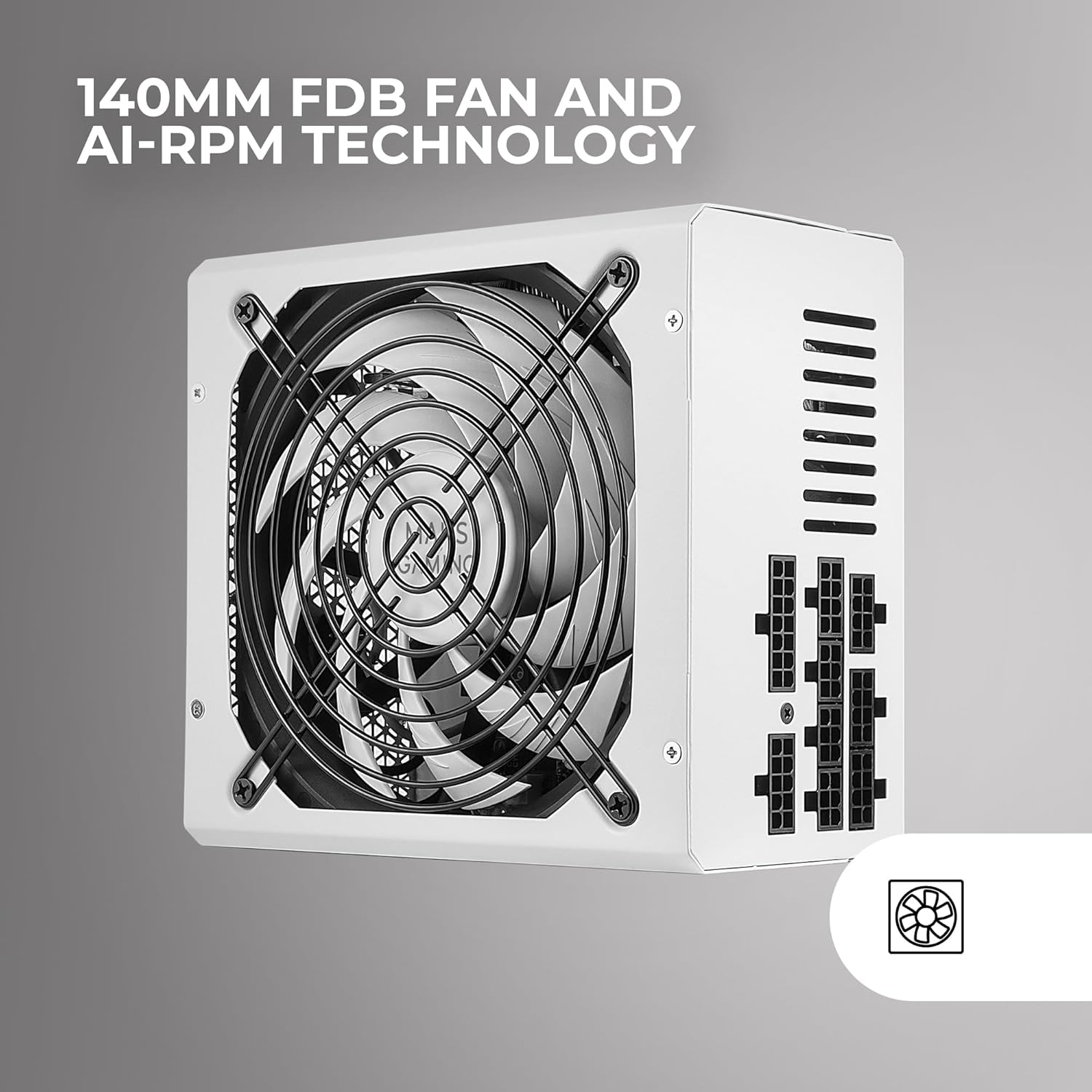 TECHNOLOGIE AI-RPM : Grâce à la technologie AI-RPM, le ventilateur de l’alimentation MPZE750M ajuste automatiquement sa vitesse en fonction des besoins de votre ordinateur, ce qui permet un fonctionnement silencieux et sans distraction ; en outre, le ventilateur FDB de 140 mm en blanc assure un refroidissement efficace et silencieux