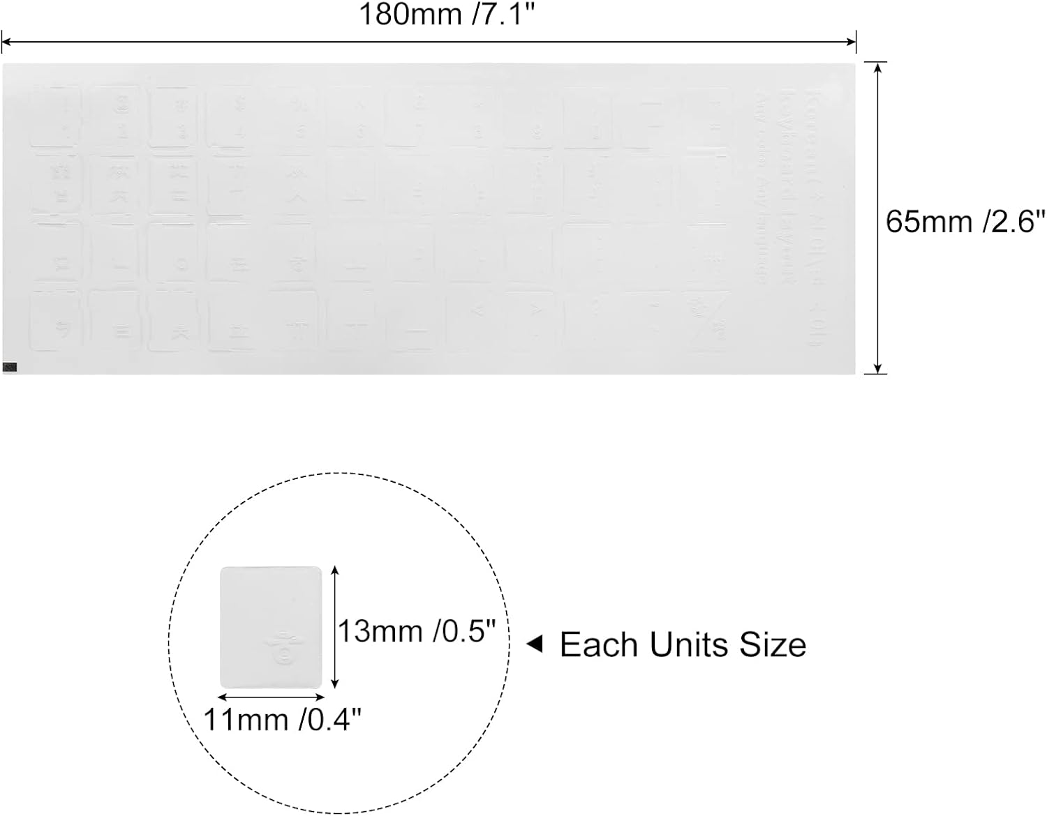 Total dimensions: 190 mm x 70 mm/7.5 x 2.8 inches (L x W); Dimensions of each unit: 13 mm x 11 mm/0.5 x 0.4 inches (L x W); Colour: transparent background with white lettering