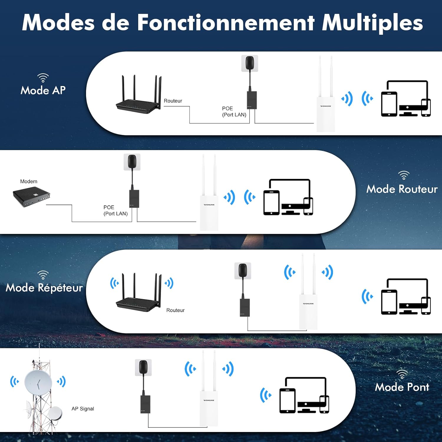 【Borne WiFi Extérieur Polyvalente】: Notre borne wifi exterieur est équipée de 2 ports Gigabit Ethernet, ce qui vous permet de connecter des appareils filaires tels que des caméras de sécurité ou des ordinateurs. Le point d’accès prend en charge les modes AP/routeur/répéteur/pont pour répondre à vos besoins d’utilisation