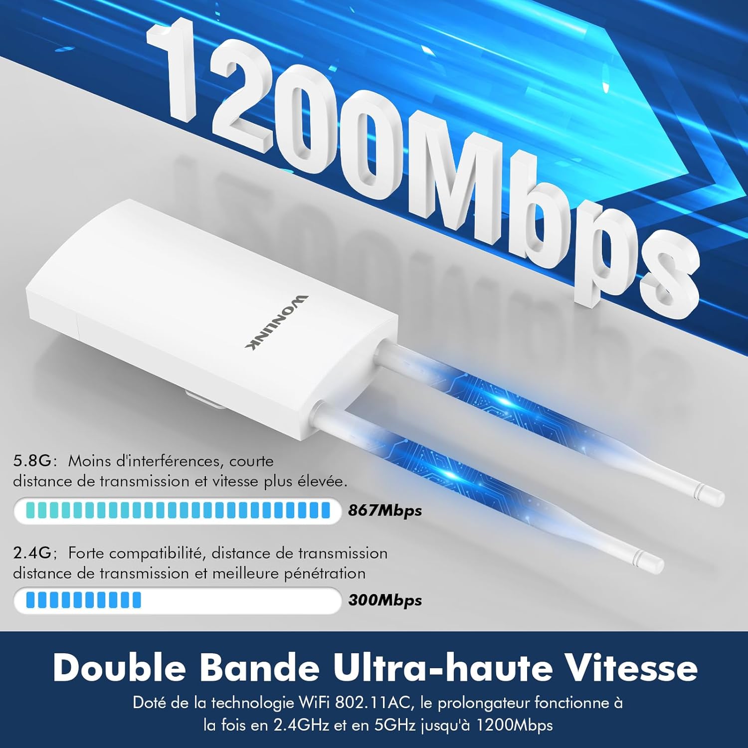 【Point d’accès WiFi Performants】: Profitez d’une connexion WiFi stable et robuste avec nos points d’accès WiFi extérieurs. Supporte la commutation bi-bande 5G/2.4G avec un débit total allant jusqu’à 1200Mbps, fournissant une connexion internet à haut débit pour les grands espaces