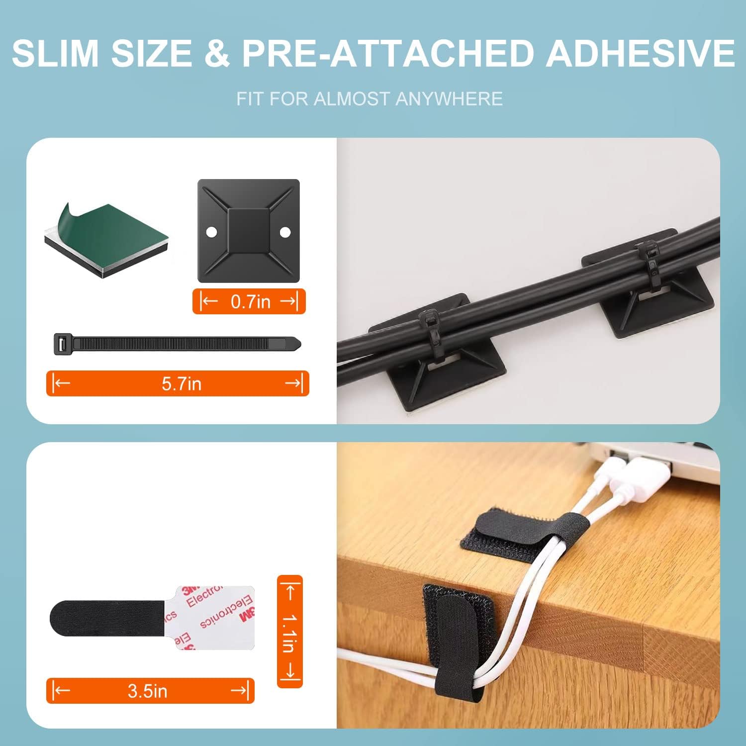 PREMIUM MATERIALS – The under desk management accessories of this set are made of high quality silicone and PC material to last so it won’t clutter up for years to come. All cable retainers, zipper holders and wall cable ties come with self-adhesive adhesive pads