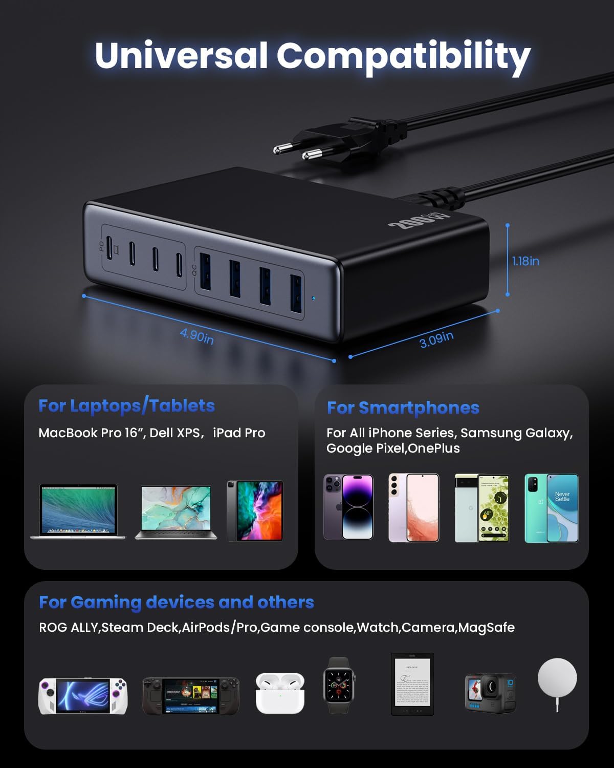 【What you get】1 x USB C charger (8-IN-1,200W), 1 x power cable (1.5M/5FT), 1 x instruction, industry-leading 40-month warranty and lifetime technical support. With this USB charger, no more searching for outlets or lugging a bunch of chargers anywhere and anytime, you can say goodbye to tangled cables and clutter, getting an organized and clean desk. Simplify your life!