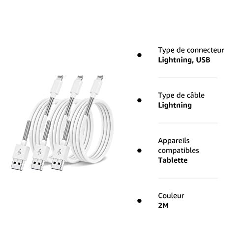 Fiche Technique [3 Pack] 2M Câble de Chargeur iPhone,MFi Certifié Câble,Câble Chargeur Apple Câble Lightning USB Compatible avec Apple iPhone 14/13/12/11/Pro Max/X/XS/XR/8 Plus/7/6/5,iPad iPod au Maroc