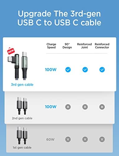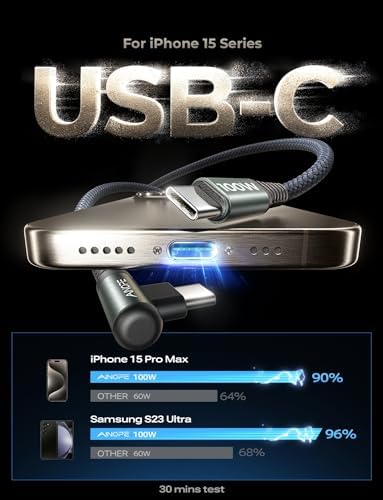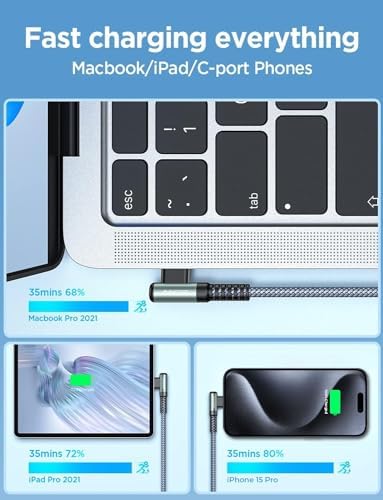 [AMAZING DURABILITY] Câble USB C renforcé à 90 degrés avec joint SR spécial, dure 30 fois plus longtemps que les câbles ordinaires, éprouvé en laboratoire pour résister à 40 000 courbures. Il intègre une technologie de soudage laser qui garantit que la pièce métallique ne se cassera pas. L’un des câbles les plus résistants jamais créés, avec une résistance à la traction capable de supporter 175 lb