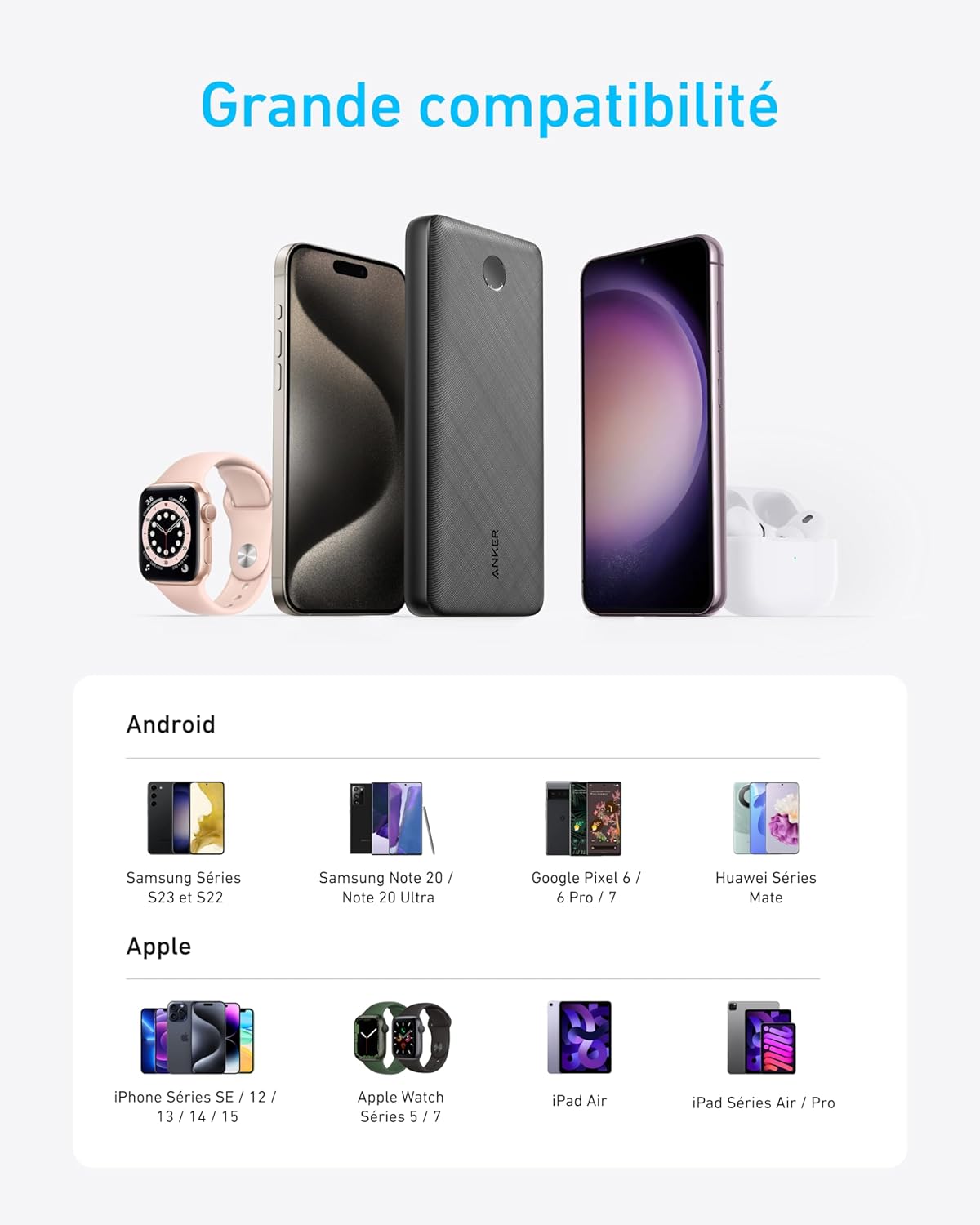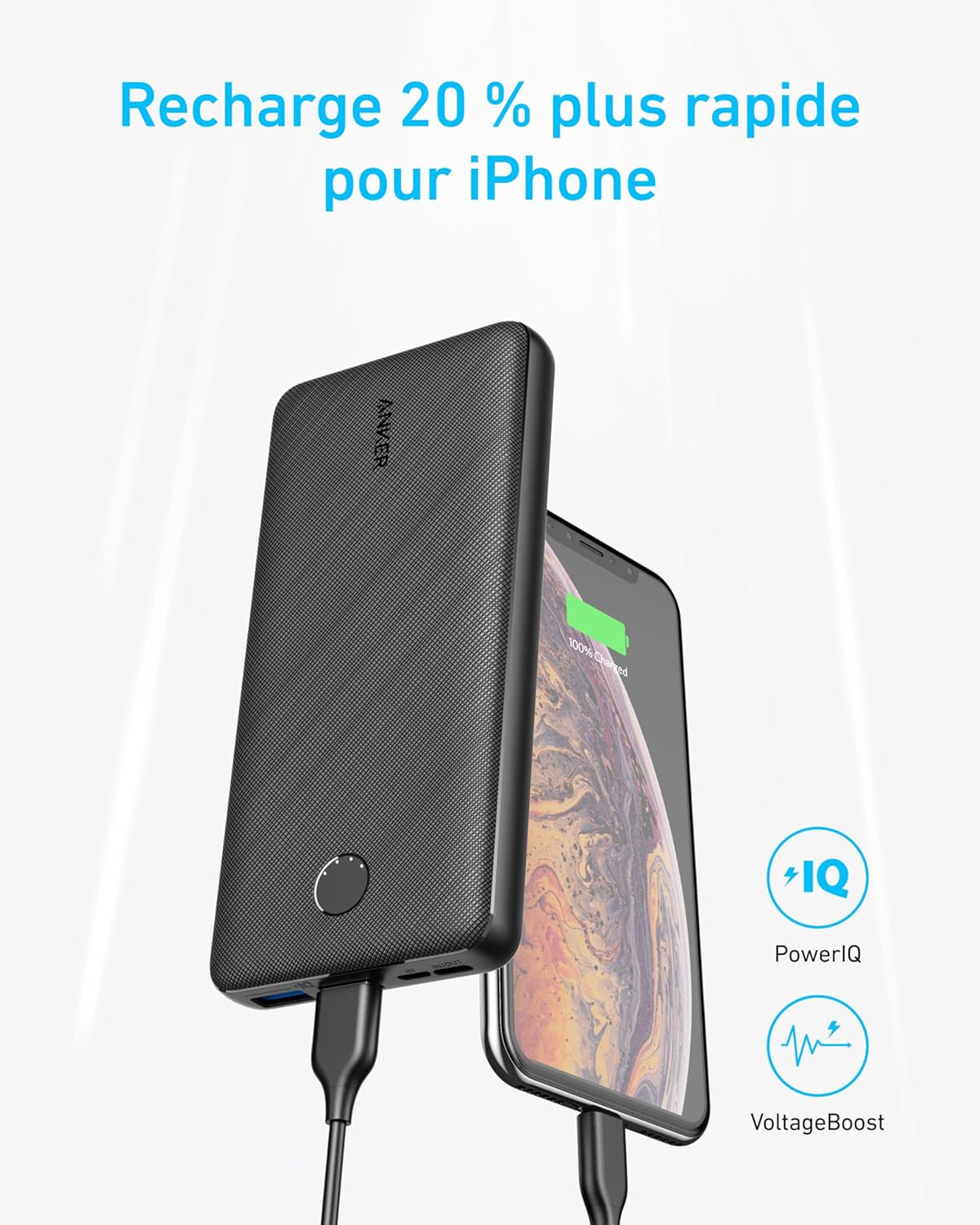 Ultra haute capacité : la capacité très importante (20 000 mAh) permet de recharger 3,6 fois un iPhone 15 et 2,9 fois un Samsung Galaxy S23 Ultra.