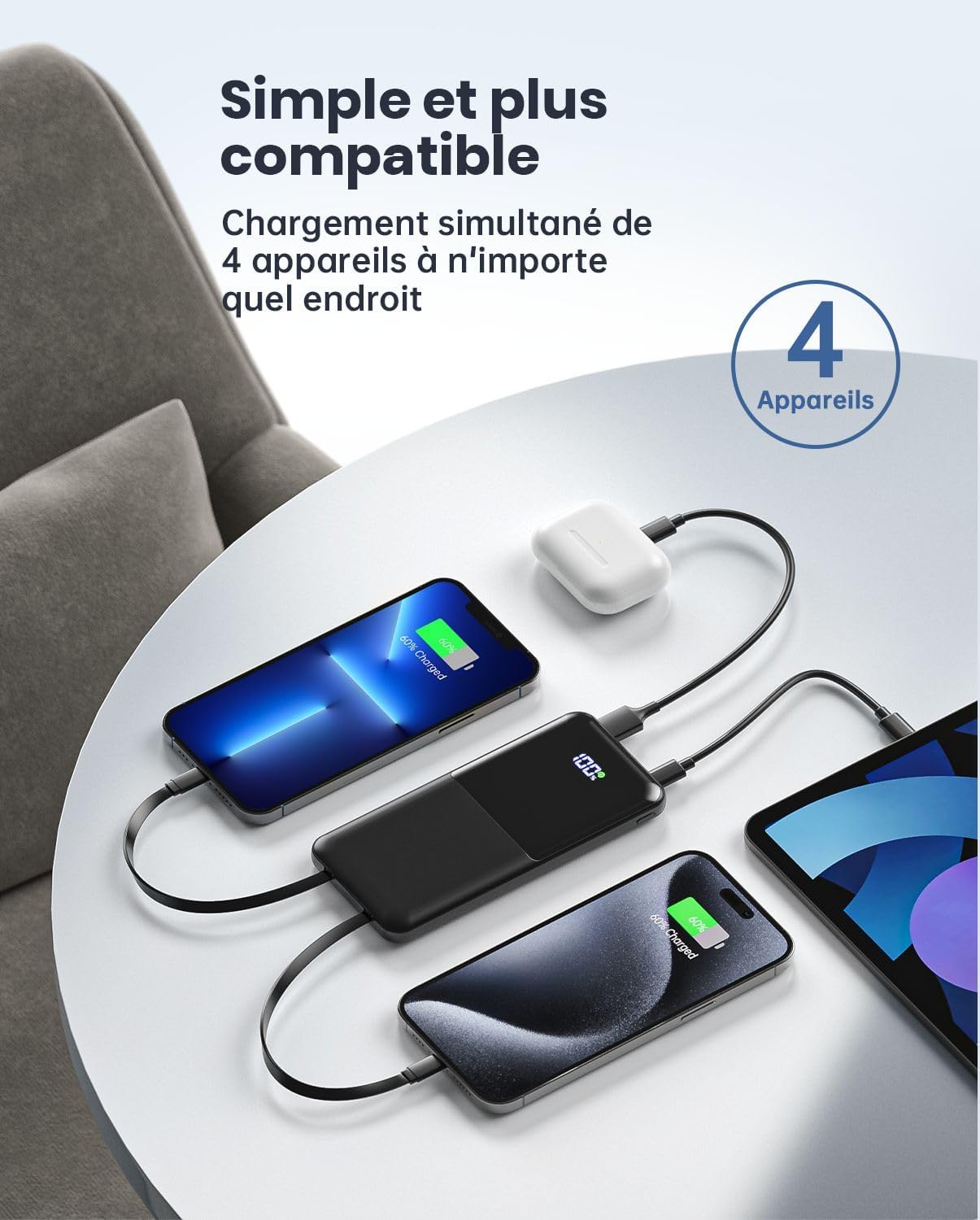 Charge Rapide PD QC 22,5 W: Batterie externe charge rapide est équipé de 4 sorties, y compris un câble de charge rapide USB C 22,5W intégré, un câble Lightning et des ports de charge rapide USB A 22,5W, USB C 20W.Chargez votre téléphone jusqu’à 65% en 30 minutes, avec la possibilité de charger jusqu’à 4 appareils en même temps.