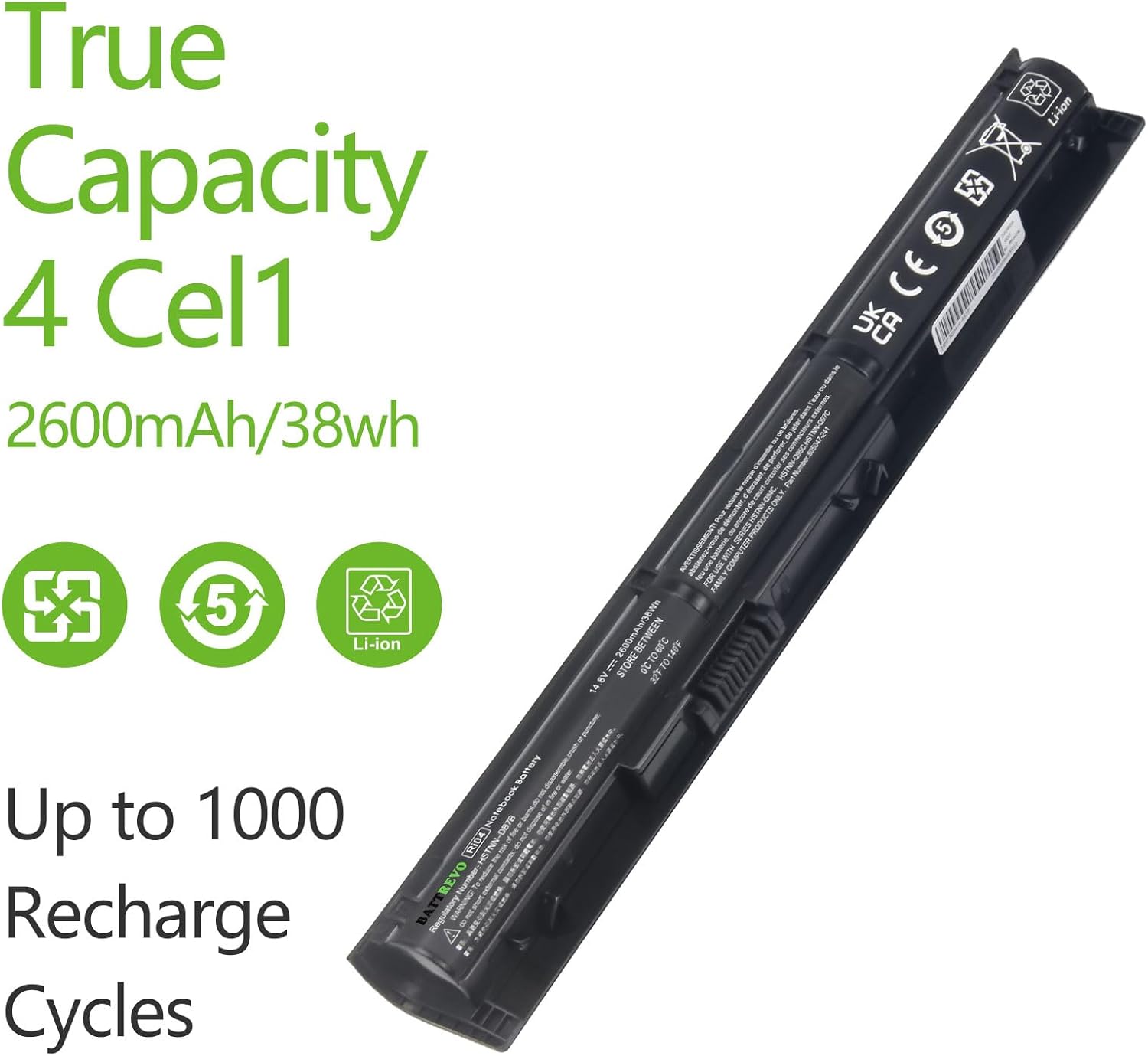 【Battery Specifications】Model: RI04; Type:Rechargeable Lithium Polymer; Voltage: 14.8V; Capacity: 38Wh/2600mAh; Number of Cells: 4 Cells; Battery Life: Up to 1000 Charge Cycles During Battery Lifetime.