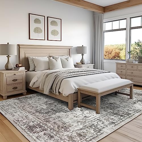 Le Prix befbee Tapis 3 x 5 cm, ultra fin et lavable pour le salon, petit tapis antidérapant pour entrée, cuisine, poils courts, ne perd pas ses poils, décoration florale vintage (marron/gris, 91 x 152 cm)