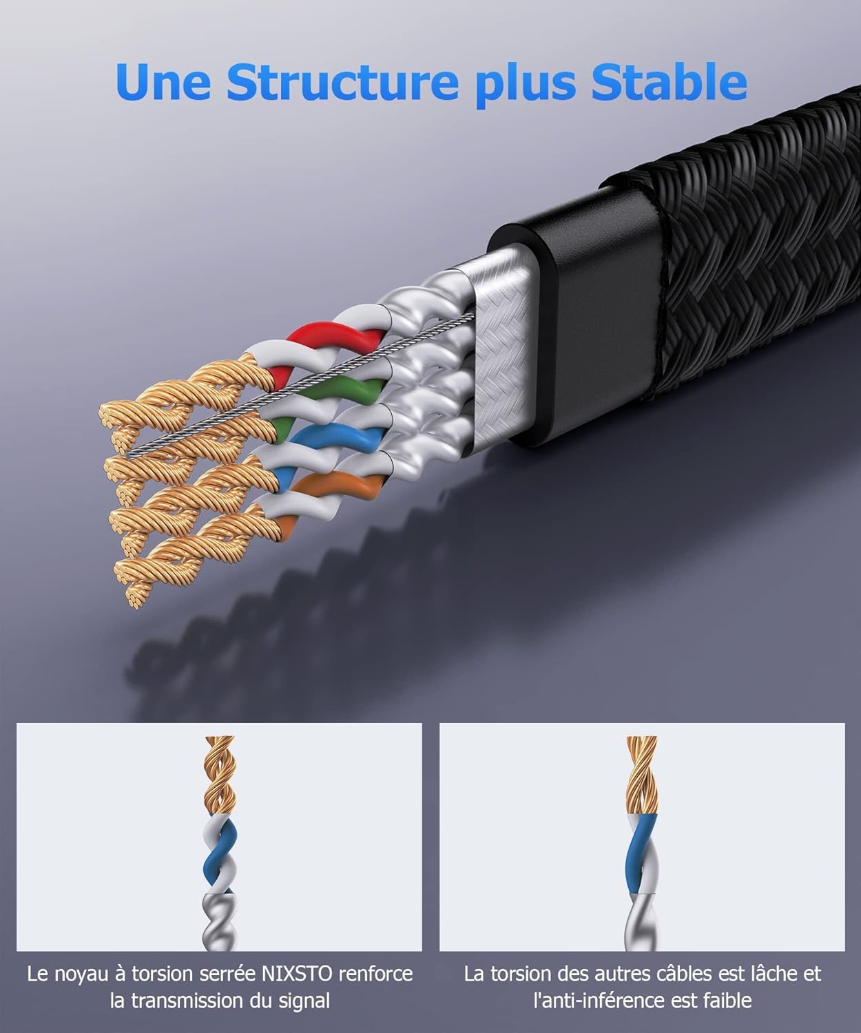 Câble Tressé en Nylon Durable : Le câble réseau CAT8 de NIXSTO est enveloppé d’un cordon de raccordement tressé en nylon haute ténacité, ce qui rend le câble LAN plus solide et plus durable et lui confère une longue durée de vie. S’il y a un problème avec le câble Cat8, veuillez nous en informer et nous vous fournirons un service après-vente dans les meilleurs délais