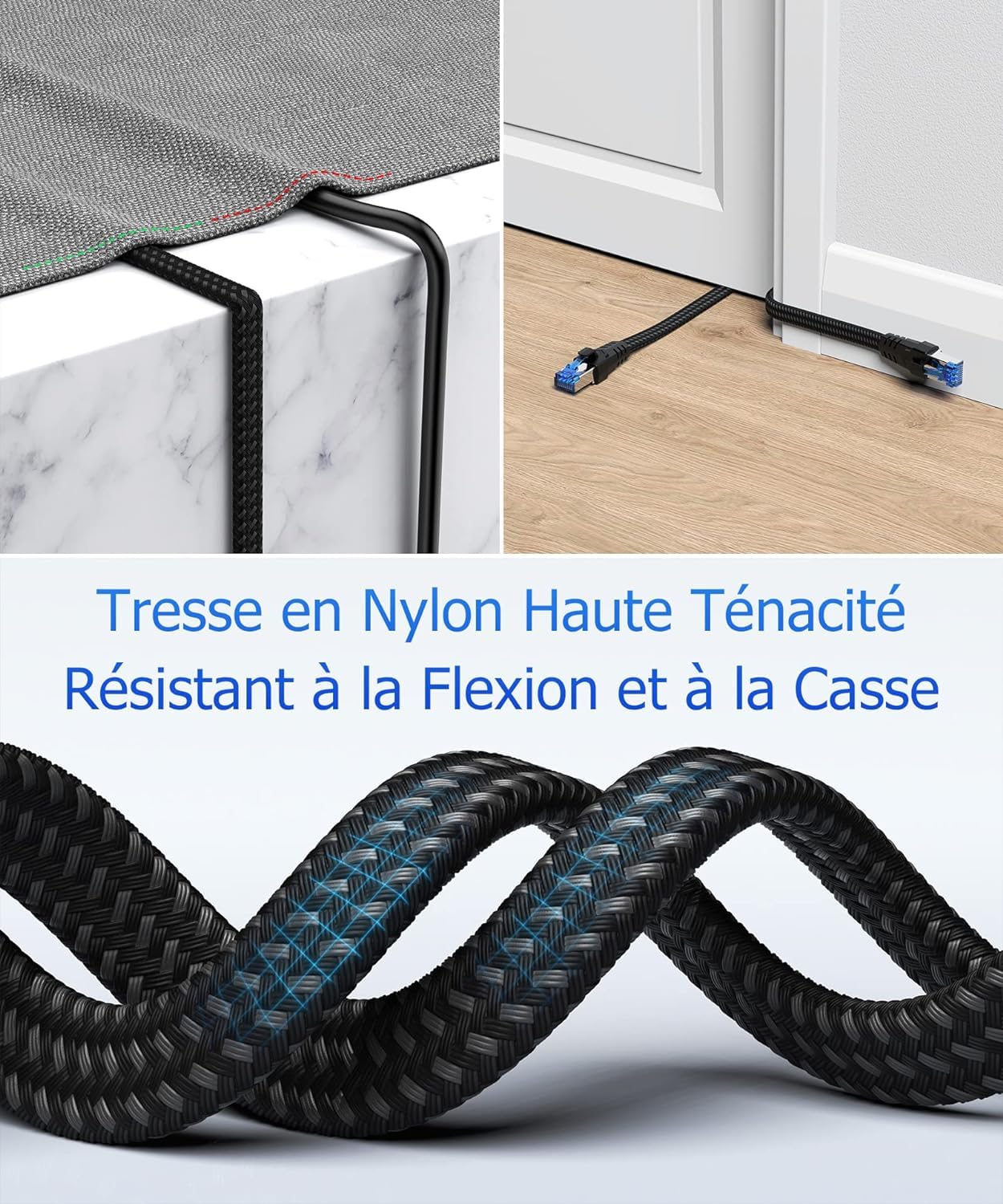 Fiche Technique Câble Ethernet Cat 8- 0.5M 1M 5M 10M 15M 20M 30M Câble de Réseau, 40Gbps 2000MHz Haute Vitesse Câble Internet, Plat RJ45 Gigabit POE Nylon Tressé Câble LAN pour PC,TV,Modem,Cadeau pour les joueurs au Maroc