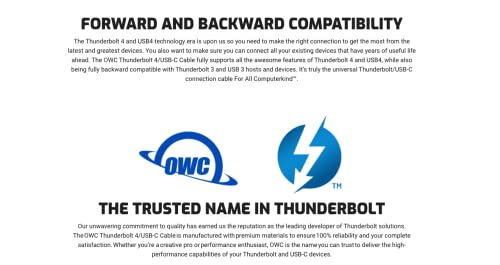 Certifié pour toutes les utilisations : profitez d’une alimentation sûre certifiée par des tests en laboratoire jusqu’à 240 W de puissance/charge pour les stations d’accueil, les adaptateurs et autres appareils, jusqu’à 40 Gb/s de performances de données et jusqu’à 8 K de capacité vidéo. Le câble OWC Thunderbolt 4 et USB4 est certifié Thunderbolt pour garantir une alimentation de 240 W 20 V/5 A, des vitesses de transfert de données de 40 Gbit/s et la prise en charge de deux écrans 4K ou d’un écran 8K.