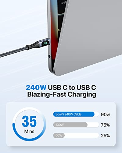 Large compatibilité : le câble de chargement USB-C SooPii 240 W fonctionne parfaitement avec les ordinateurs portables, téléphones portables, tablettes, stations d’accueil et plus encore.