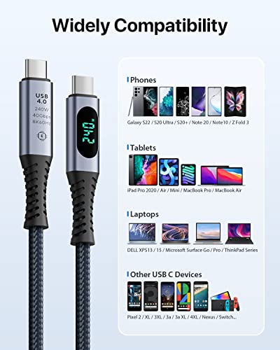 Fiche Technique Câble SOOPII USB 4 avec écran LED, prend en charge la vidéo 8K, transfert de données 40 Gbit/s, câble de chargement USB C vers USB C 240 W, compatible avec iPhone 15, MacBook, moniteur Thunderbolt 4, stations d’accueil
