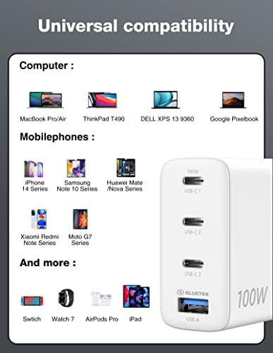 Fiche Technique Chargeur mural USB C 100 W, TECKNET GaN Ⅲ Bloc de chargeur rapide USB-C portable avec câble de type C, adaptateur d’alimentation PD pour iPhone 14/14 Pro, MacBook Pro, iPad, AirPods, Dell XPS, Pixel, Samsung, PS5, Switch