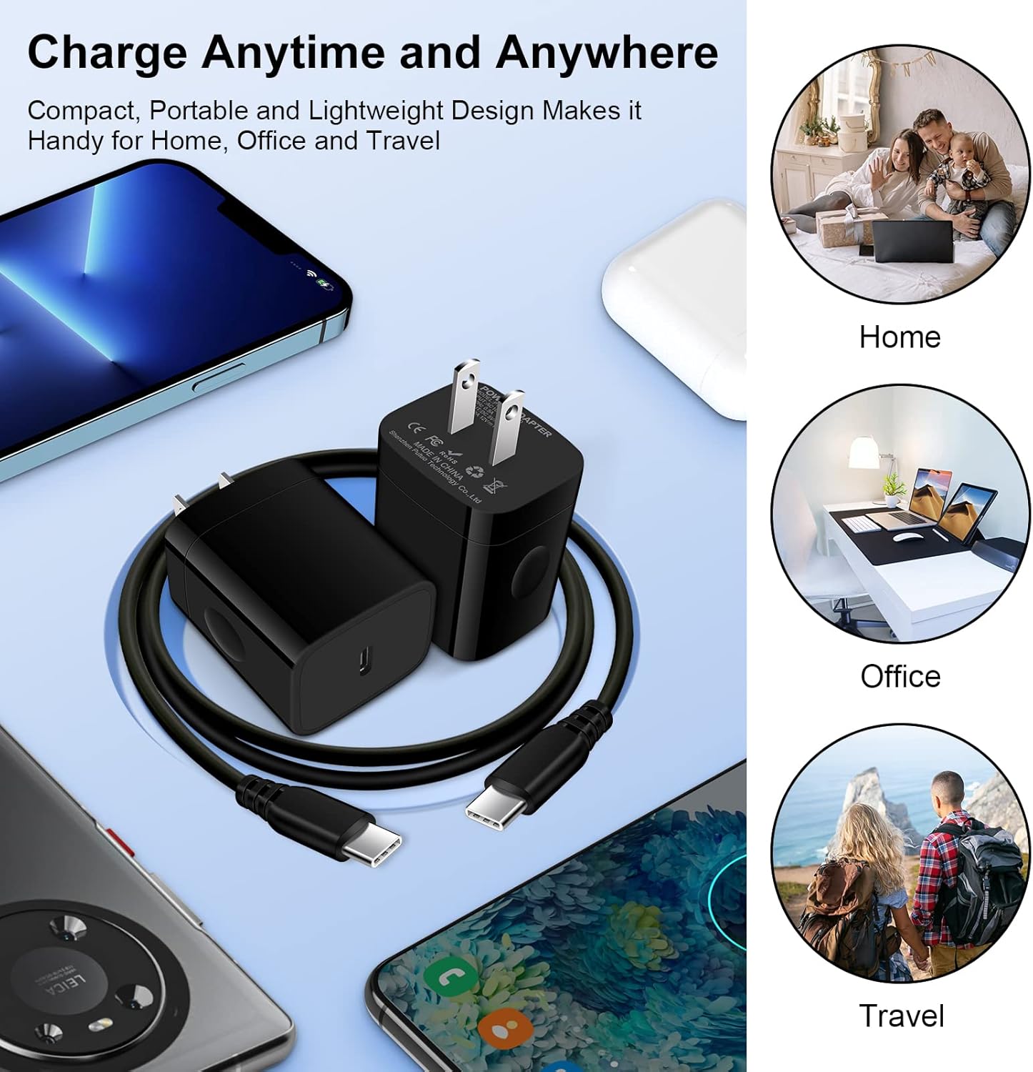 Prise murale d’alimentation USB Type C 20 W PD charge rapide adaptative Samsung Galaxy S23 S23+ S23 Ultra S22 S22+ S22 Ultra S21 S20 FE Note 20 Ultra de 0 % à 50 % en seulement 30 minutes, charge complète en seulement 1 heure et 10 minutes, aide vous travaillez efficacement