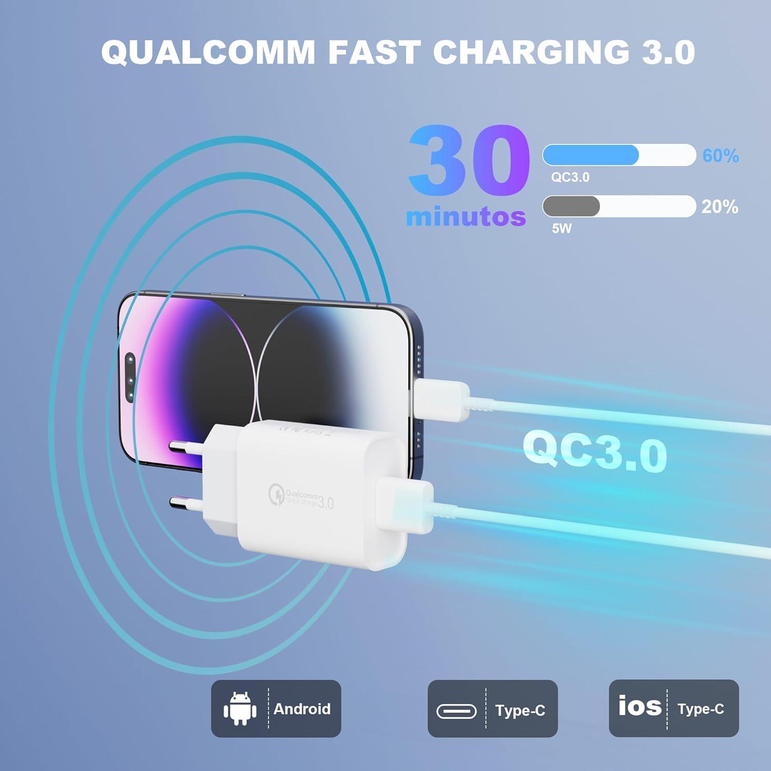 Liste d’emballage:1 x QC 3.0 chargeur rapide USB, 1 x USB C câble de charge 2M. Service en ligne 24 heures sur 24. En cas de problème de qualité, veuillez nous contacter