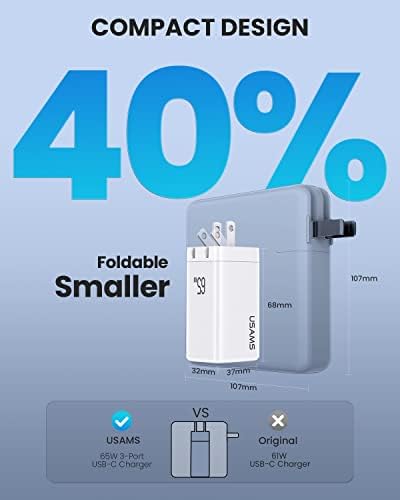 【Conception portable】 : Dimensions : 2,7 x 1,5 x 1,2 pouces, ce qui est 40 % plus petit que le chargeur d’origine MacBook 61 W. La prise pliable est plus facile à ranger, alimentez votre MacBook, iPhone et AirPods en même temps, et transportez-la pendant votre voyage d’affaires ou vos vacances, vous ne vous inquiétez pas du problème de charge. Excellente efficacité de charge et moins de chaleur dans un design compact et léger grâce à la technologie GaN III.