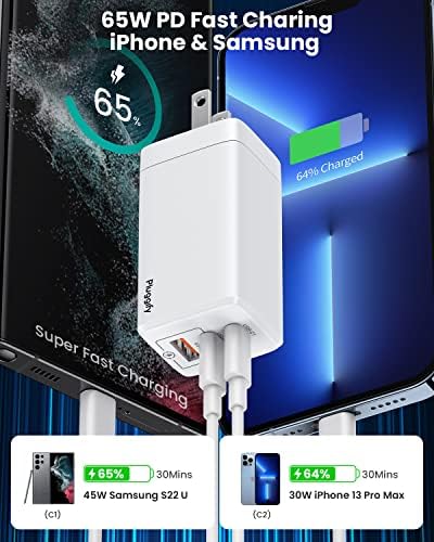 Fiche Technique Chargeur USB C 65 W, bloc de chargeur ultra rapide GaN III à 3 ports, chargeur mural compact et pliable PD3.0/QC4.0, chargeur de téléphone pour iPhone série 11/12/13/14, MacBook, iPad, Dell XPS 15, Galaxy S23-21 et plus
