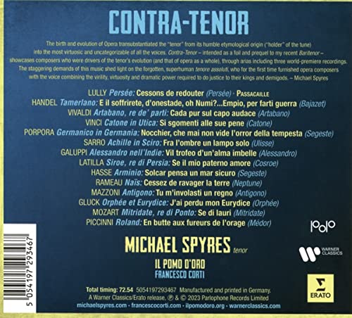 Le nouvel album de Michael Spyres, enregistré avec le fabuleux Il Pomo d’Oro sous la direction de Francesco Corti, présente des œuvres de Haendel, Hasse, Mazzoni, Pergolesi, Porpora, Sarro, Scarlatti, Vinci, Vivaldi et bien d’autres encore, allant même jusqu’à Mozart. Il déclare : « En vérité, le concept de cet album est né de mes recherches visant à trouver les extrêmes absolus de la voix humaine, qu’il s’agisse du yodel, du chant de gorge tuvian, du chant diphonique ou des nombreuses catégories de la voix classique. un album dédié à cette époque de l’histoire vocale qui est de toute évidence inclassable par le système Fach, sans parler de pratiquement inchantable pour la plupart des chanteurs d’aujourd’hui”.