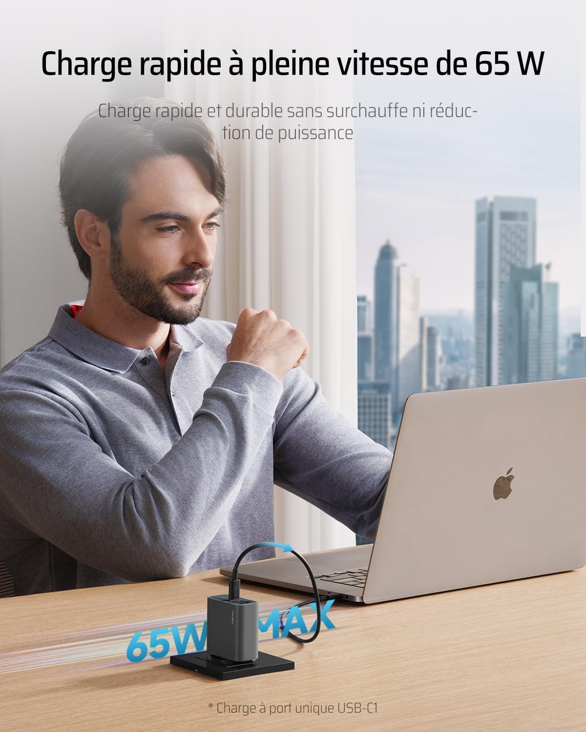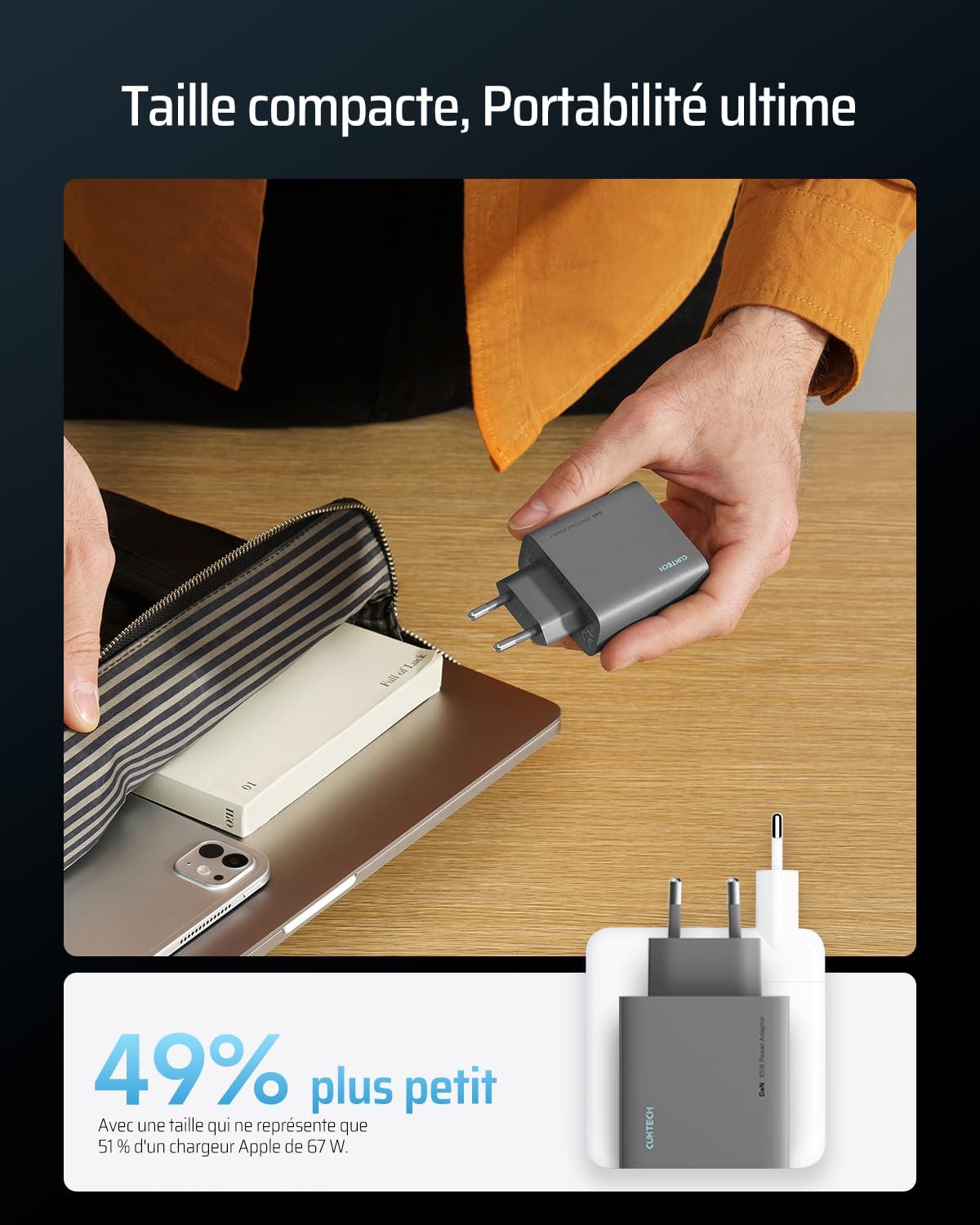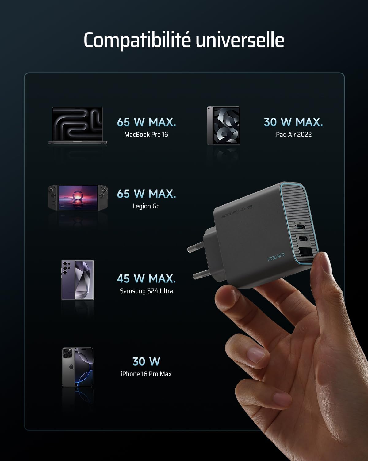 Fiche Technique CUKTECH USB C Charger 65W, 3 Ports GaN III and PPS PD3.0 Fast Charger, 65W USB C Fast Charger Compatible with MacBook Air/Pro, iPad Pro, iPhone 16/15/14/13, Samsung S24/S23, Xiaomi au Maroc