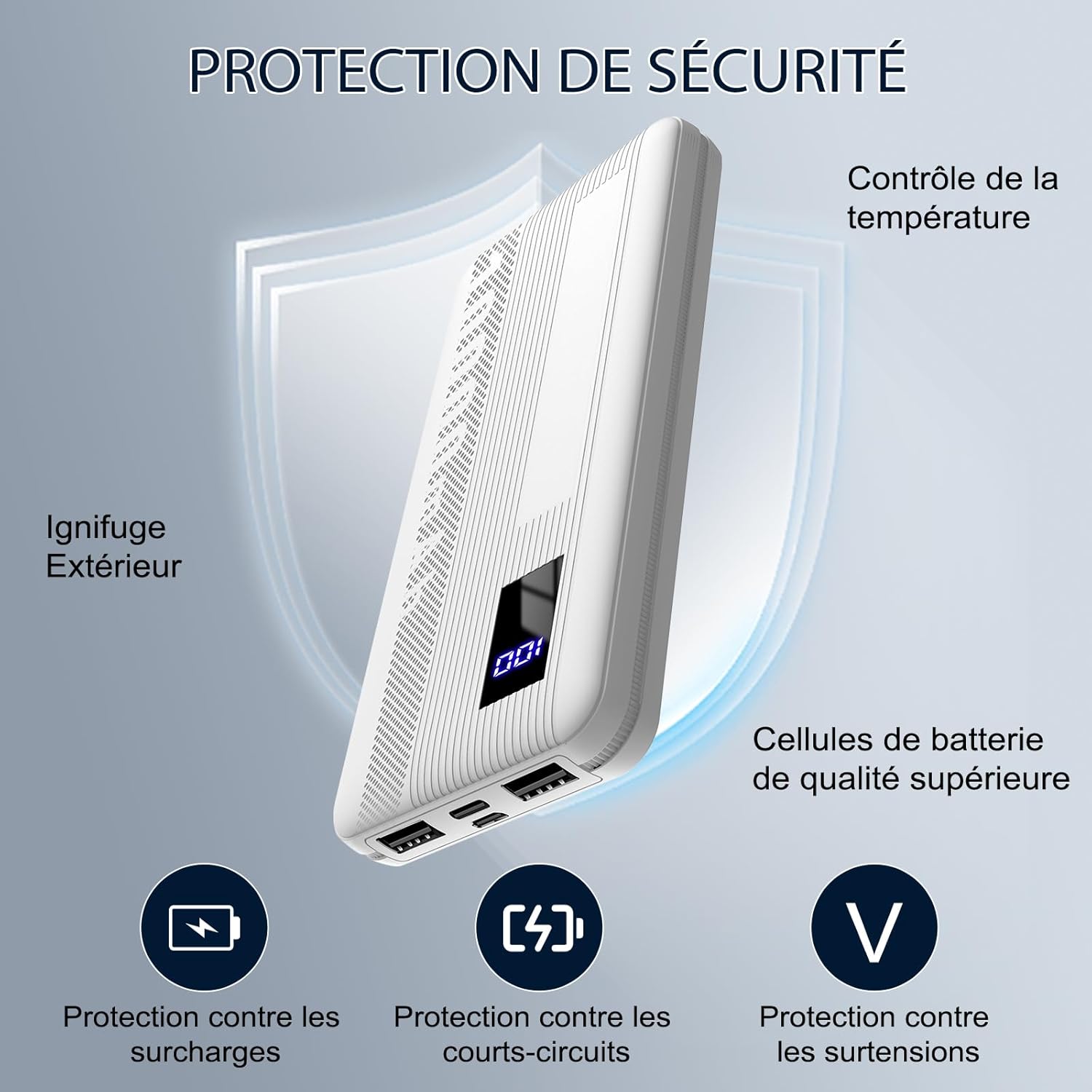 CIRCUIT INTÉGRÉ INTELLIGENT: Doté d’un circuit intégré intelligent, ce chargeur portable prévient les risques de surcharge, de surtension, de surintensité et de court-circuit. Il assure ainsi la sécurité de vos appareils tout en affichant précisément le niveau de batterie restant sur son écran LED (avec une précision de 1%). Que vous ne chargiez qu’un seul appareil ou trois simultanément, vous saurez toujours exactement combien de puissance vous reste !