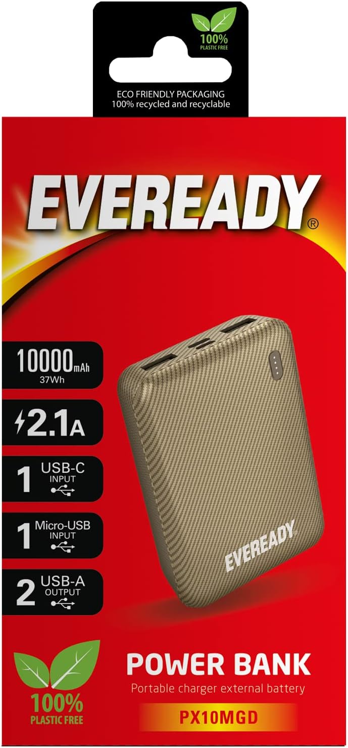 Fiche Technique EVEREADY – Batterie Externe 10000 mAh + Câble USB-A/Micro-USB – Batterie Externe Téléphone – Doré au Maroc
