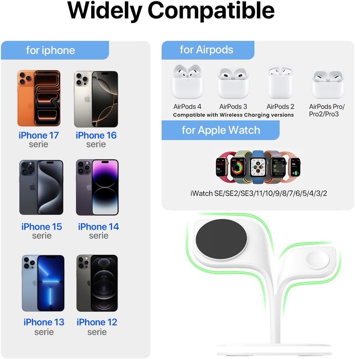 Compatible Models Our magnetic induction charging station supports wireless fast charging up to 15W for your phone. This 3 in 1 charging dock is compatible with iPhone 17/16/15/14/13/12 series, Apple Watch Ultra/10/9/8/7/SE/6/5/4/3/2, AirPods 3/2/Pro/Pro 2, and other Qi-enabled devices. Charge your phone, headphones and watch simultaneously, eliminate bulky cables and save space.