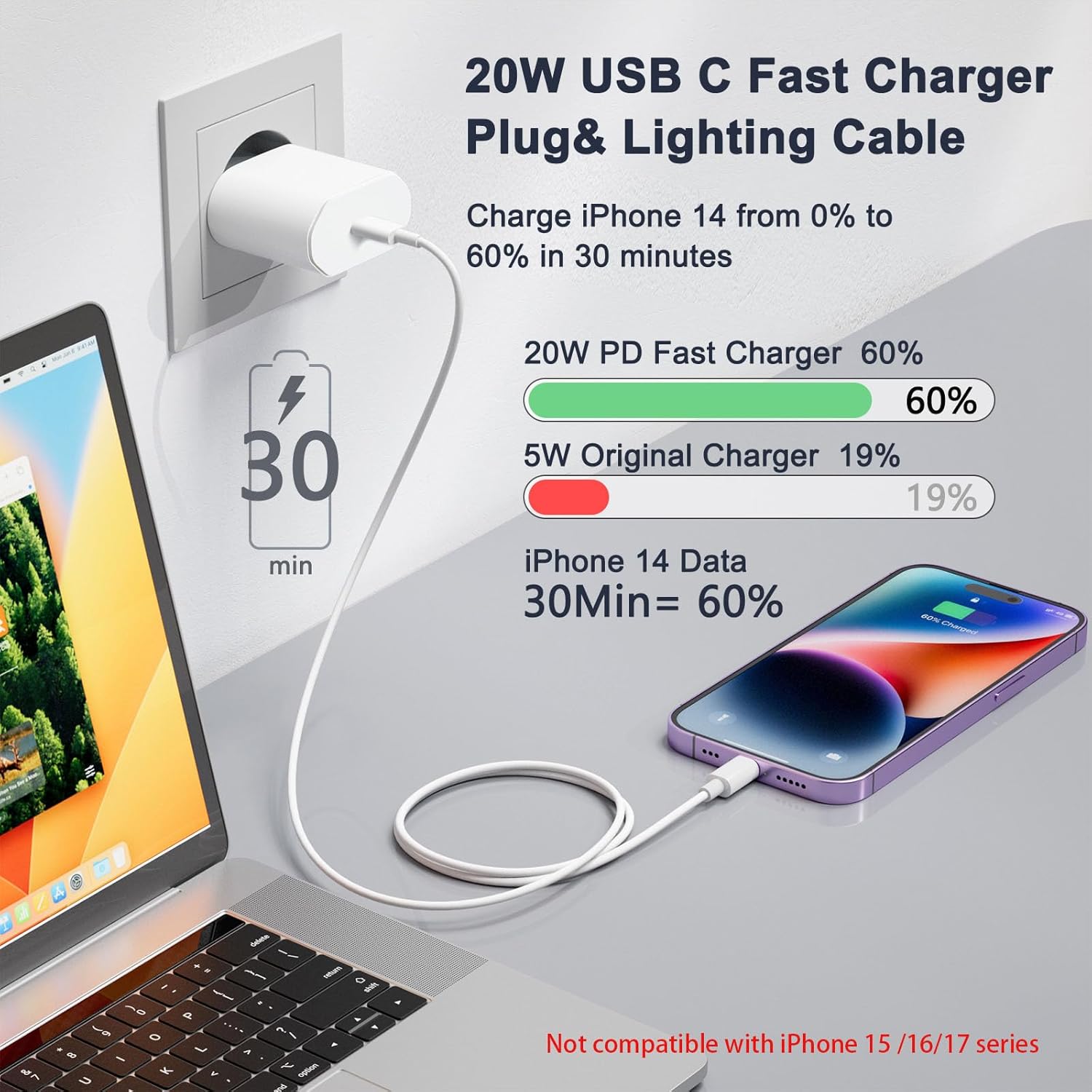 【Wide Compatibility】Fast Charger for iPhone 20W + iPhone Cable, Compatible with iPhone 14/14 Plus/14 Pro/14 Pro Max/13 mini/13/13 Pro/13 Pro Max/12 mini/12/12Pro/12. Pro Max/ 11/ 11 Pro Max/ XS Max/ XS/ XR/ 8 Plus/ 8, Pad Pro, AirPods Pro, Galaxy, etc.(Not compatible with Phone 15 & 16 & 17)