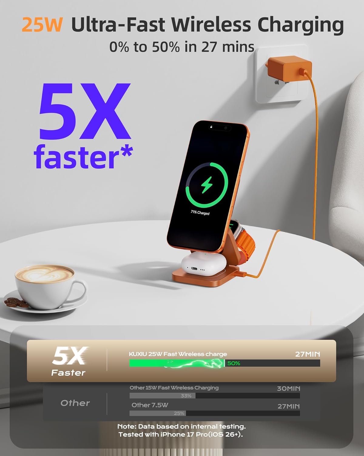 25W Fast Charging: Perfectly compatible with MagSafe, unlock the fastest wireless charging for iPhone with 25W. Charge your Phone 17 Pro up to 50% in just 27 minutes — 5 times faster than standard wireless chargers. (Maximum speed 25W for iPhone 17/16 series (requires iOS 26+); 20W for iPhone 17 Air.)
