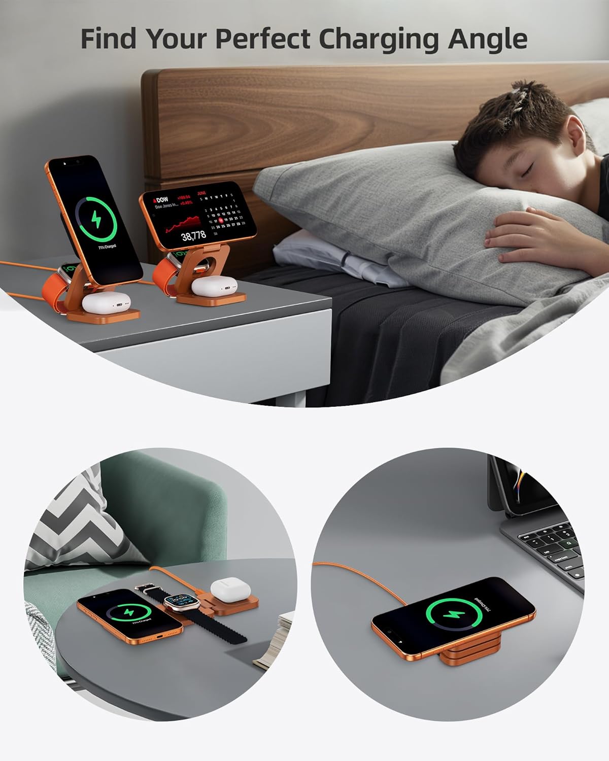 Multi-Angle and Dual View Charging Stand: The innovative three-axis rotating design combines 3 charging modules into one, providing multiple charging modes such as folded, lying or standing. One charging station meets all your needs. 360 degree adjustable viewing angle, switch to landscape mode for watching shows/standby, or portrait mode to browse social networks/video calls