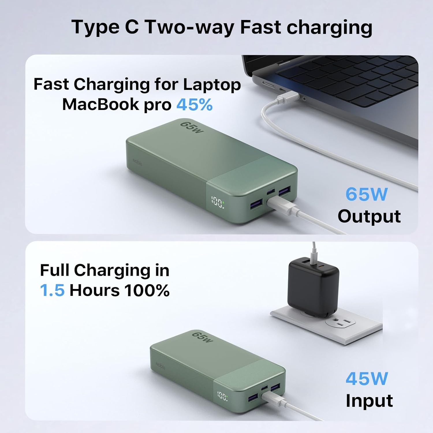 65W fast charging: This external charger supports two-way fast charging (max. output). 65W, Max input 45W) with PD/QC protocols. It charges a laptop to 45% in 30 minutes and fully charges in 1.5 hours, quickly powering most devices on the go
