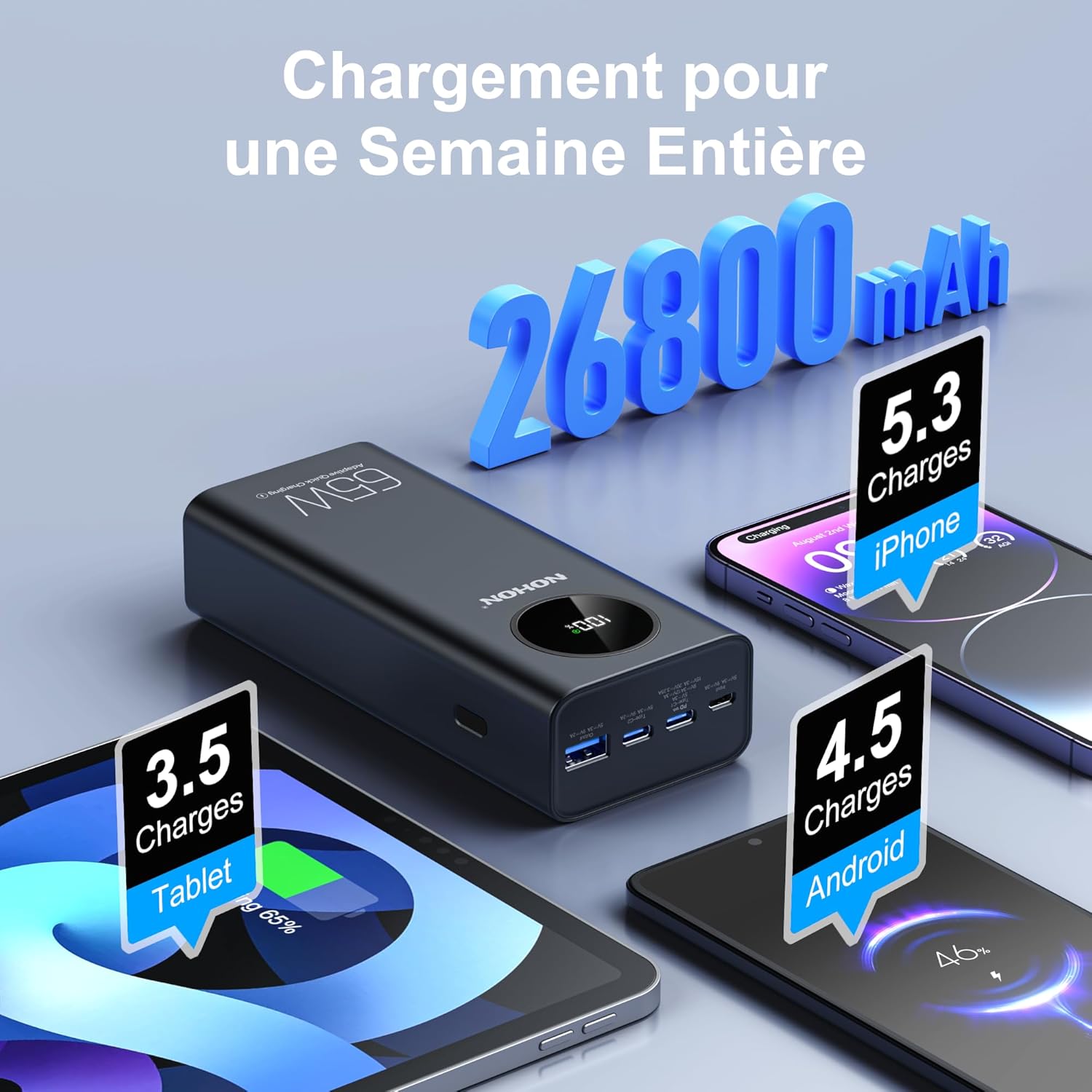 Fiche Technique NOHON 65W Batterie Externe 26800mAh Power Bank: 4 Ports Batterie Chargeur Portable USB C PD 3.0 Charge Rapide avec écran LED | Compatible avec iPhone15 14 13 12 11 Macbook Huawei iPad Pro Samsung au Maroc