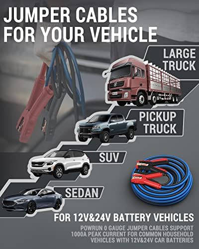 Avis sur Powrun P025 Câbles de démarrage pour batterie de voiture 12/24 V, câbles de démarrage robustes 1000 A avec sac de transport, kit de câbles de démarrage pour véhicules avec moteurs à essence jusqu’à 8,0 L et moteurs diesel 6,0 L
