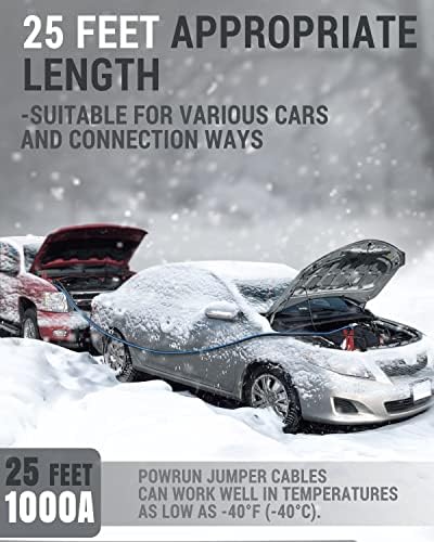 Le Prix Powrun P025 Câbles de démarrage pour batterie de voiture 12/24 V, câbles de démarrage robustes 1000 A avec sac de transport, kit de câbles de démarrage pour véhicules avec moteurs à essence jusqu’à 8,0 L et moteurs diesel 6,0 L
