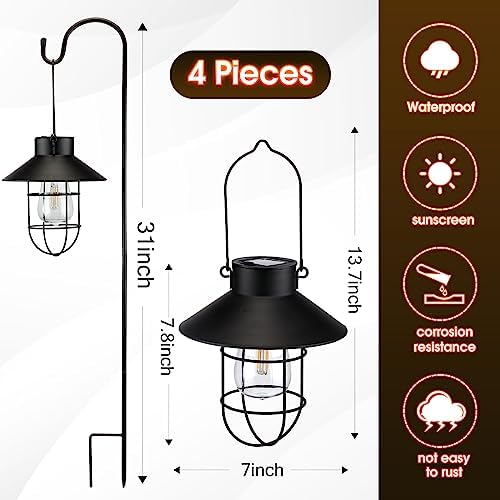 Le Prix Retisee Lot de 4 lanternes solaires suspendues d’extérieur de 78,7 cm avec crochet de berger à double usage, lampes suspendues étanches pour allée, lanterne de jardin en métal pour chemin, patio, cour, pelouse, allée (noir)