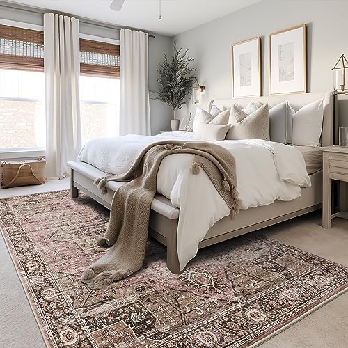Le Prix Roxstand Tapis 3 x 5 – Tapis de cuisine lavable, antidérapant, petit tapis pour entrée, résistant aux taches, tapis vintage pour la décoration de la maison, tapis doux à poils courts (rose/marron, 90 x 150 cm)