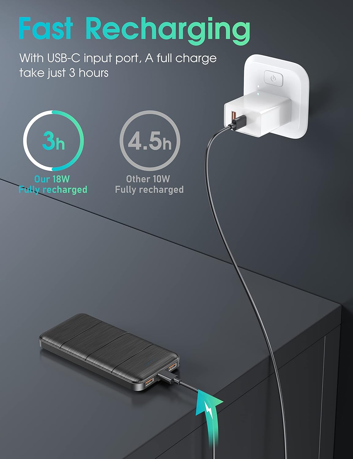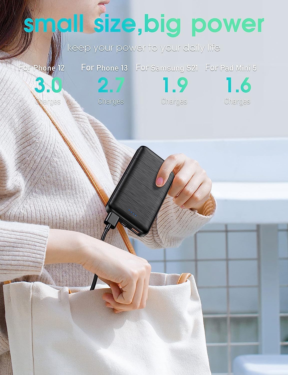 【3 sorties et 2 entrées Power Bank USB-C】 Notre batterie externe est conçue avec 3 sorties (1 x USB-C PD20W + 2 x USB SCP22,5W Max) et 2 entrées (1 x USB-C PD18W Max + 1 x Micro -USB 18W Max) pour charger 3 appareils en même temps. Vous n’avez donc pas à vous soucier d’une batterie vide. (un câble USB-C est inclus)