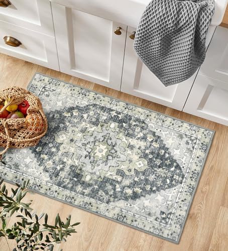 Le Prix Uphome Tapis d’entrée bohème 2 x 3 cm, tapis lavable vintage vieilli pour salle de bain, petit tapis gris doux antidérapant, tapis oriental floral à poils courts pour porte de cuisine, chambre à coucher