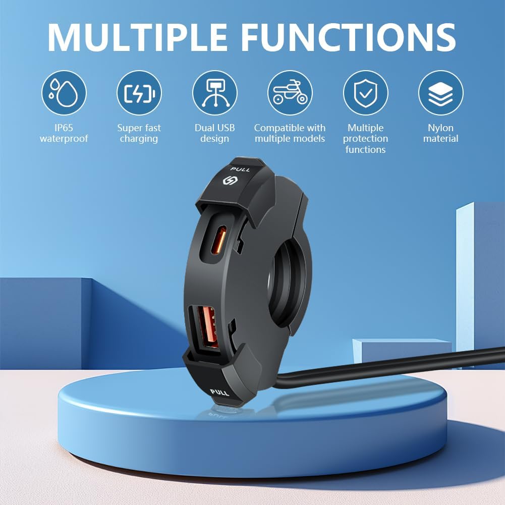 【Widely Used】: the USB plug input voltage of the 2 in 1 motorcycle charger is (12V-24V), and the output voltage can be automatically adjusted according to your device (USB-A: 5V/3.4A, 9V/2.5A, 12V/1.5A) TYPE-C: 5V/3A 9V/3A 12V/2.5A 5A), perfectly compatible With iPad, iPhone, HTC, Galaxy, BlackBerry, Digital Cameras, PDAs, MP3 Players, Mobile Phones and GPS etc.