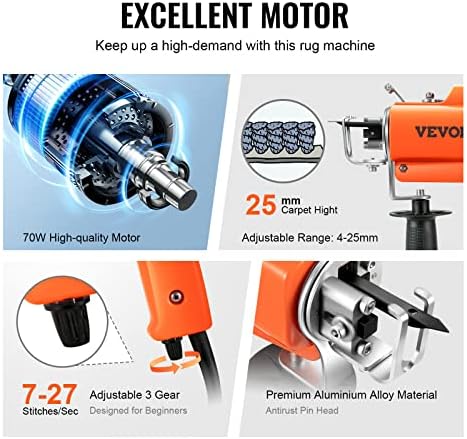 Maximisez l’efficacité de fonctionnement : ce kit de touffetage de tapis de 70 W peut atteindre 5 à 50 points par seconde et a une vitesse à vide de 10 000 tr/min et une augmentation de l’efficacité de travail de 80 à 100 fois. La plage réglable de hauteur du tapis est de 4 à 25 mm. Il y a un bouton pratique de réglage de la vitesse (débutant, professionnel et vitesse maximale) ; que vous soyez débutant ou professionnel, cela vous aidera à réaliser rapidement des tapis et des œuvres d’art.