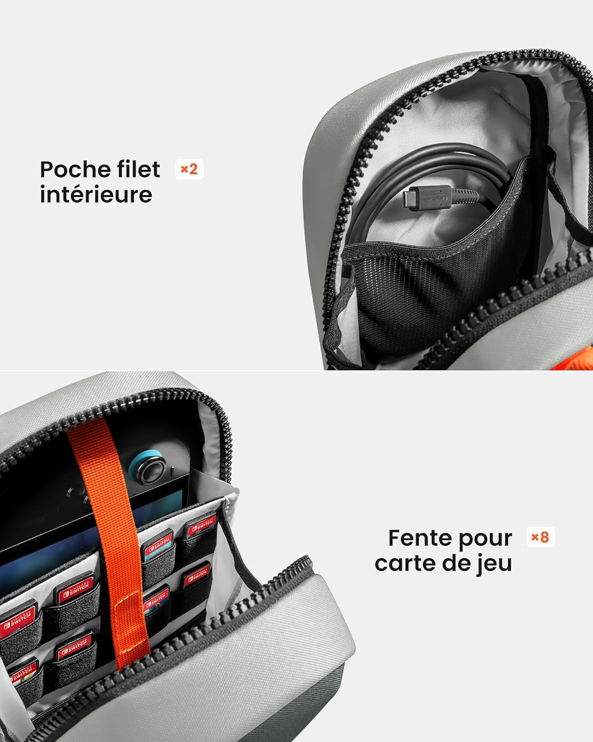 Fiche Technique tomtoc Shoulder Bag Sling Bag for Nintendo Switch 2 Console 2025, Protective Case Travel Bag with 8 Game Cartridges, Suitable for Charger and Accessories, Grey au Maroc